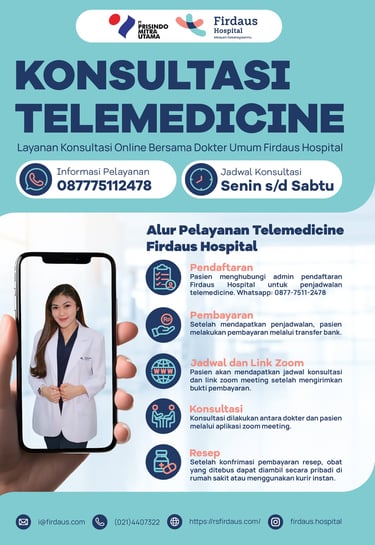 Firdaus Hospital menghadirkan layanan Telemedicine yang dilengkapi dengan layanan pengiriman obat, sehingga pasien dapat tetap menikmati layanan kesehatan dari rumah.